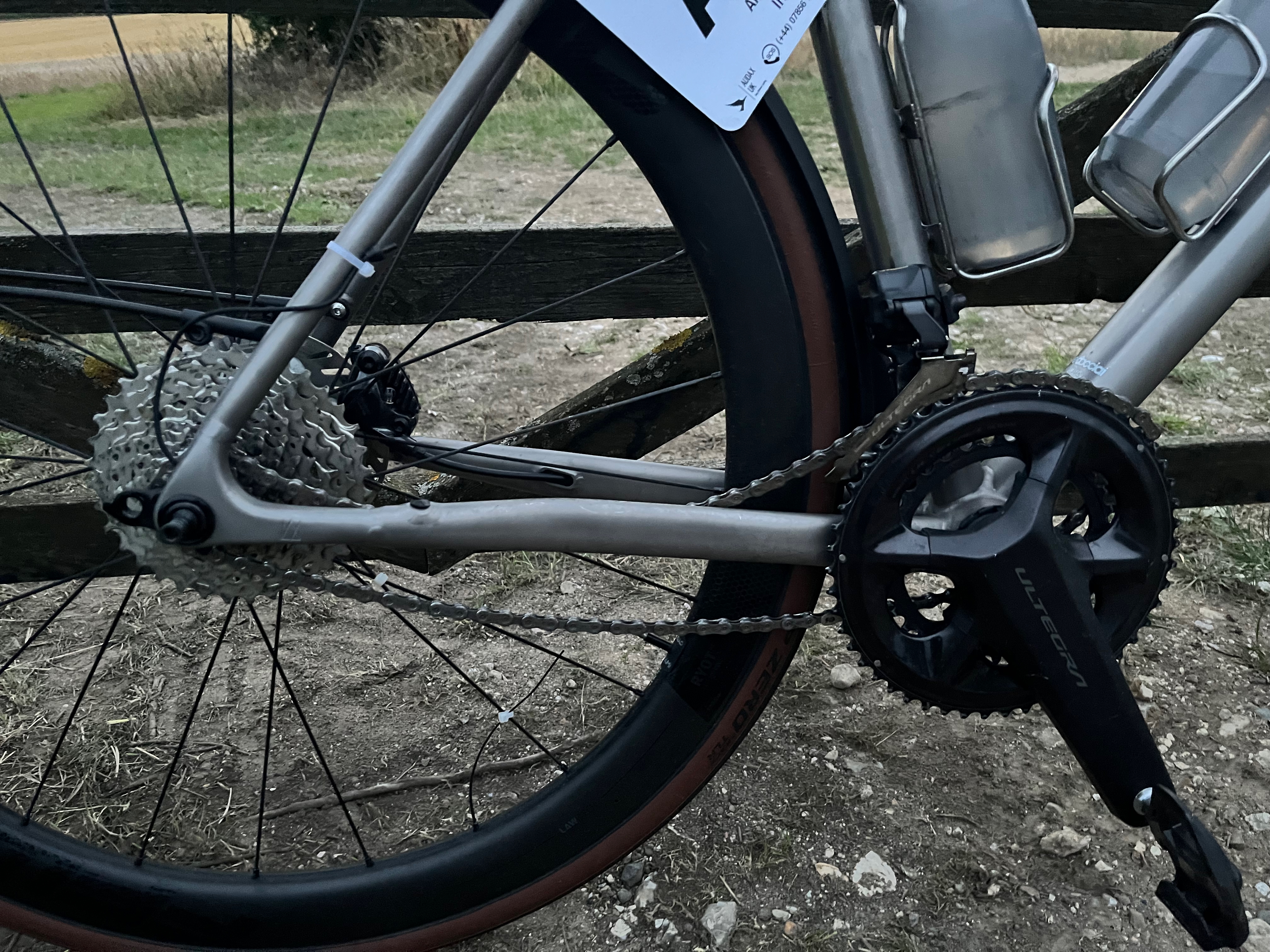 I rode my new Mason Aspect Integrale. I had given it a test ride at the Celtic Knot 1000 and was very happy with its performance. The drivetrain was Shimano Di2 Ultegra, with a compact gearing setup. The wheels were FFWD RYOTT 44. I love these wheels; they feature external brass nipples and DT Swiss 240 hubs with a ratchet system. I had mounted Pirelli P-Zero Race TLR 30mm tires and carried a spare (non-tubeless) one with me, strapped to the Tailfin bridge. The bike had permanent mudguards (I live in Ireland, after all!), from Portland Design Works.